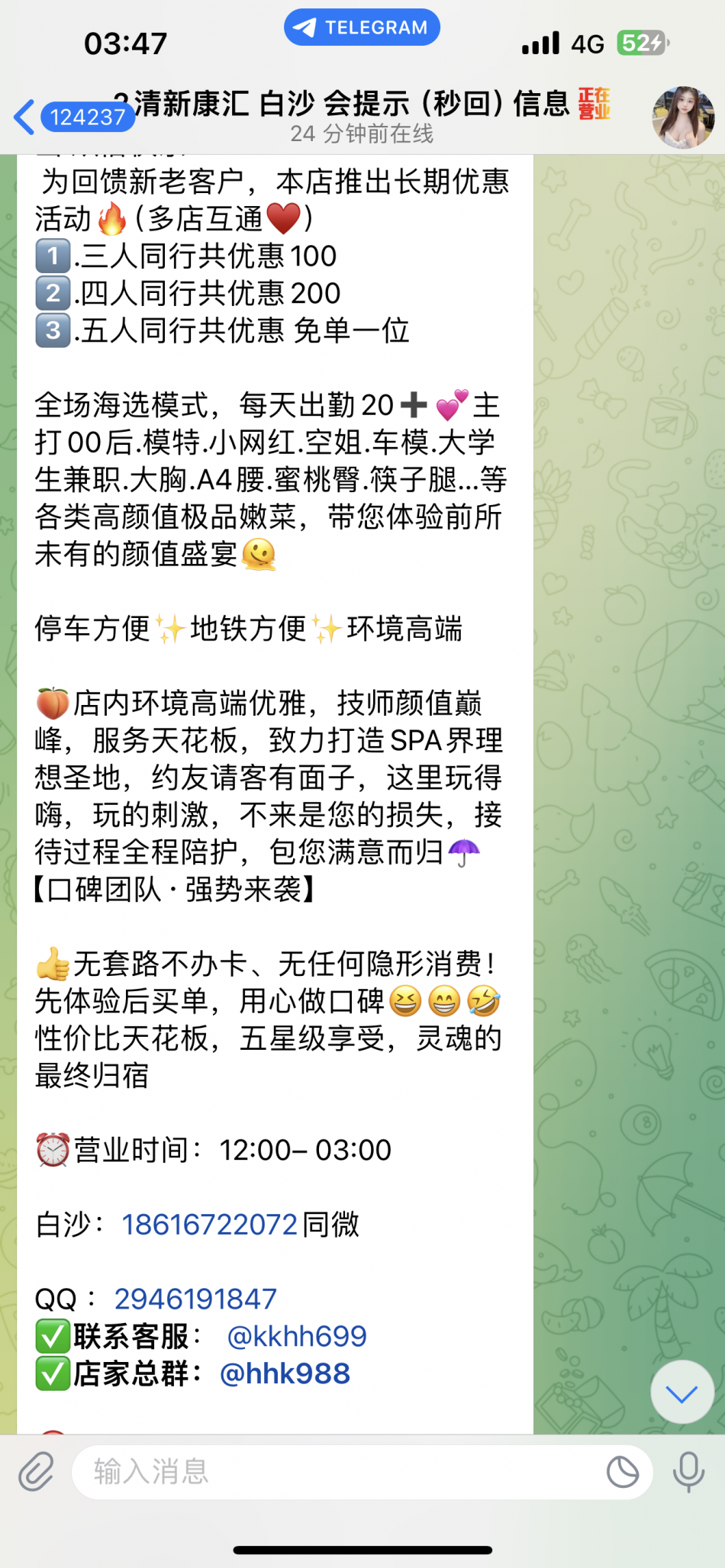 哎,一般到不经常来的地方完,基本都是通过电报找,没办法只能趟水了,其实我还是觉得妹子还行,商家大傻逼!